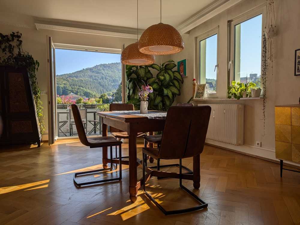 Die Wohnung besticht durch ein großzügiges Wohnzimmer und Esszimmer, die durch eine Flügeltür miteinander verbunden sind. Vom Esszimmer gelangen Sie auf einen Balkon mit Blick auf das alte Schloss und den Merkur.
