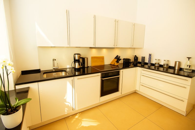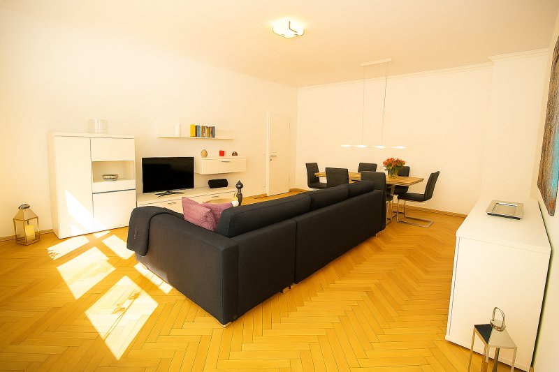 Hochwertig möblierte 2 Zimmer Wohnung in Düsseldorf Düsseltal zu vermieten Die Wohnung befindet sich im 2 Obergeschoss eines gepflegten Mehrparteienhauses in der Lindemannstraße 10 und bietet rund 74 m² Wohnfläche Sie ist modern ausgestattet und vollständig möbliert Das Wohnzimmer verfügt über eine elegante Eckcouch die auch als Schlafsofa genutzt werden kann einen großen Esstisch mit Stühlen eine Wohnwand mit Glasvitrine Kabel TV und edlen Parkettboden Die separate weiße Hochglanzküche mit Granitplatte ist mit Induktionsfeld Backofen Kühl Gefrierkombination Spülmaschine Kaffeemaschine Mikrowelle und Waschmaschine mit integriertem Trockner ausgestattet Das Schlafzimmer bietet ein Doppelbett 160 x 200 cm und zwei Kleiderschränke Das Bad verfügt über eine bodengleiche Dusche Rainshower Dornbracht Armaturen und Dusch WC Eine große Dachterrasse mit Sitzmöbeln Sonnenliegen und Dusche steht zur gemeinschaftlichen Nutzung bereit Einkaufsmöglichkeiten Restaurants und der Zoopark sind fußläufig erreichbar.