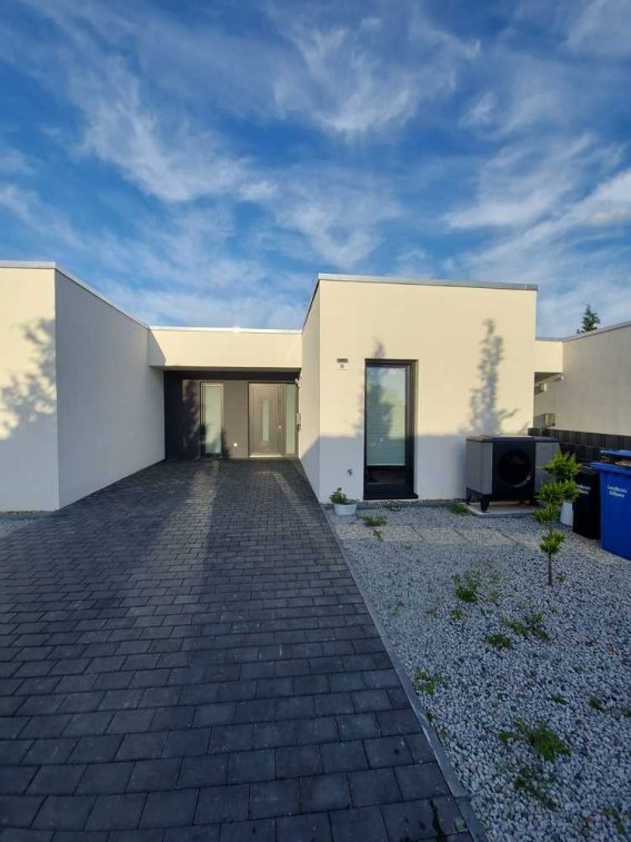 Reihenmittelbungalow barrierefrei und altersgerecht mit kleinem Garten in gehobener Ausstattung mit drei Schlafzimmern, einer (zum Wohnzimmer hin) offenen Küche, einem Badezimmer mit ebenerdiger Glasdusche, Heizungs-sowie Abstellraum, Geräteschuppen.