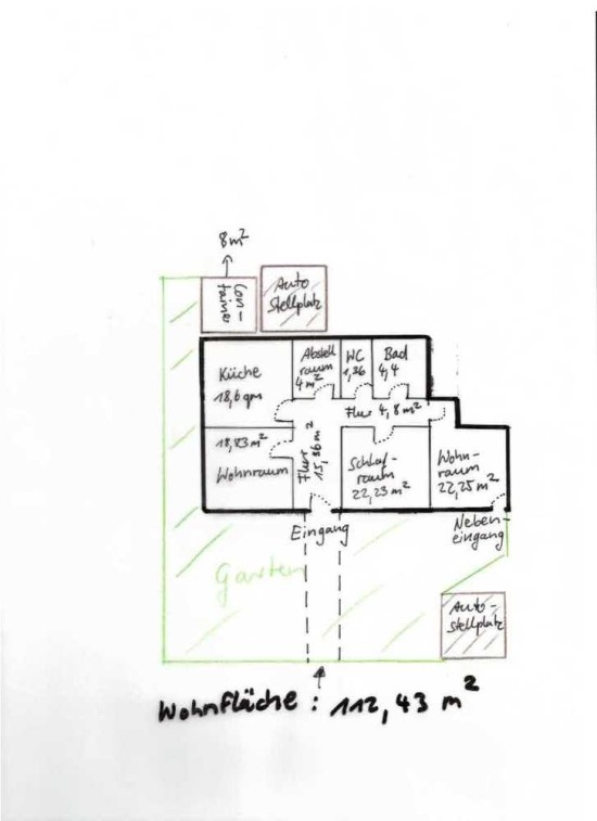 Helle 3-Zimmer Wohnung im Erdgeschoss mit ca. 113 m² Wohnfläche. Inklusive sind die 2 Stellplätze, wovon einer überdacht ist. Es gibt eine große Wohnküche und eine kleine Speisekammer. Das Bad hat eine geräumige begehbare Dusche (barrierefrei) und das WC ist extra. Hinter dem Haus befindet sich ein 8qm großer Container für z. B.: Fahrräder oder Motorrad. Die Wohnung ist sehr gut für eine Zweier WG geeignet, da es 2 seperate Eingänge gibt.