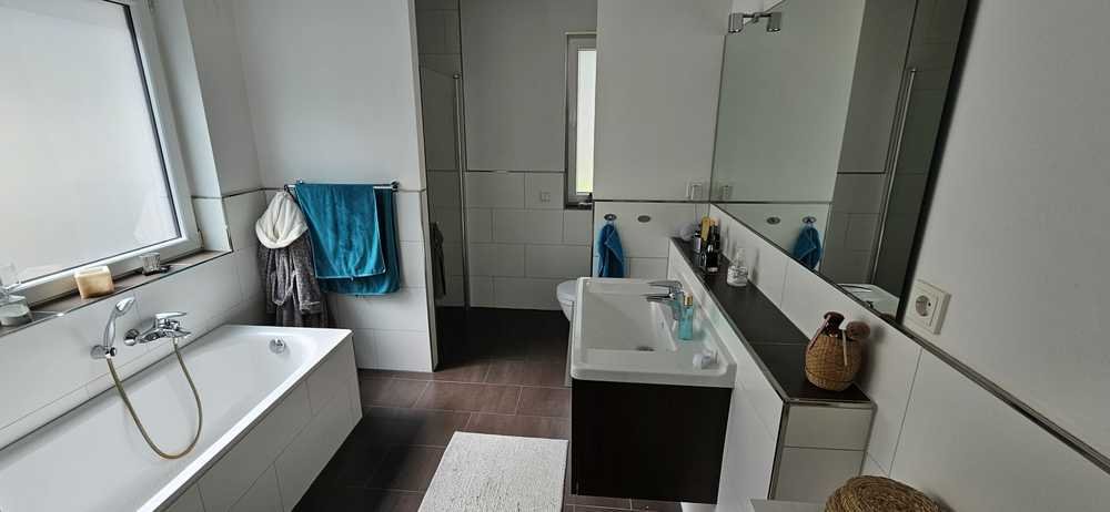 • Badezimmer: Großes Badezimmer mit Badewanne, bodentiefer Dusche mit Echtglastür, Waschtisch mit Unterbauschrank und zwei Fenstern