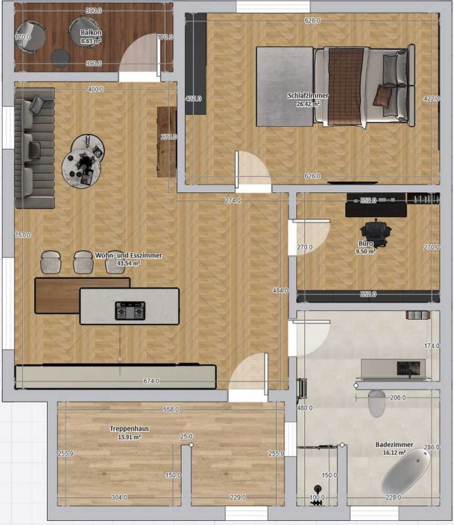 Die Dachgeschoss Wohnung verfügt über Dachschrägen auf der Rechten Seite seite die in der 2D Skizze nicht berücksichtig sind.