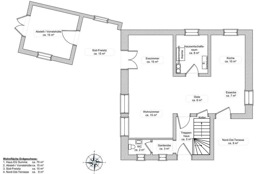 Ausstattung: Das Herzstück des Hauses bildet das weitläufige Wohn- und Esszimmer im Erdgeschoss – lichtdurchflutet, offen und mit Blick auf den Teich. Auf der gegenüberliegenden Seite befindet sich die moderne, helle Küche mit zweizeiliger Einbauküche und gemütlicher Essecke. Im Erdgeschoss sorgt eine Fußbodenheizung für behagliche Wärme, während in den oberen Etagen moderne Heizkörper installiert sind. Die Gas-Brennwerttherme gewährleistet effiziente Energieversorgung. Das EG und die Bäder /WC sind gefliest, Schlaf- und Arbeitszimmer mit neuem Vinyl ausgestattet. Das Hauptbad im Obergeschoss verfügt über Badewanne, Dusche, WC und Waschtisch; das Gäste-Bad im Dachgeschoss über Dusche und WC. Ein praktischer Hauswirtschaftsraum im Erdgeschoss bietet Platz für Waschmaschine, Trockner sowie Heiz- und Elektrotechnik. Zudem steht eine überdachte Abstellhütte (ca. 15 m²) zur Verfügung – ideal für Vorräte oder Gartengeräte.