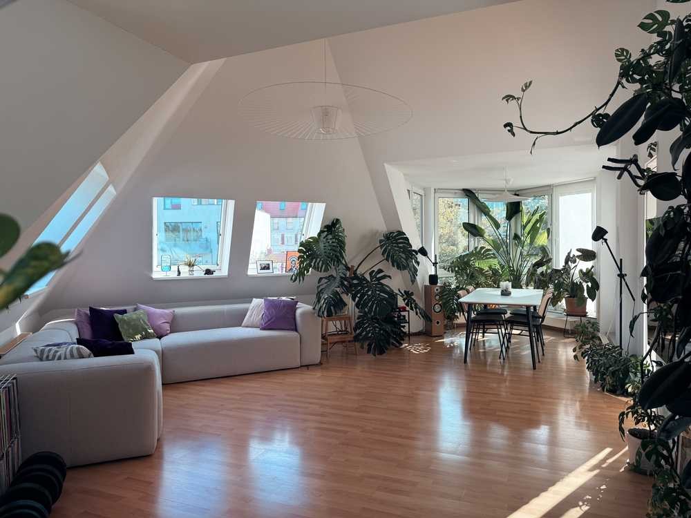 This bright, fully furnished 2 room penthouse apartment (approx. 95 m²) occupies the top floor of a well-maintained 1997 building with lift in a quiet street in Berlin-Weißensee.