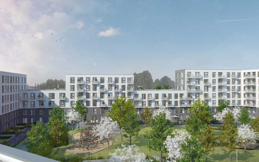 Hohe Eingangsportale, filigran gefasst, eine wertige Fassade aus Klinkerriemchen in den unteren Geschossen sowie versetzte Balkone und Loggien fügen sich zu einem spannungsreichen Fassadenbild.