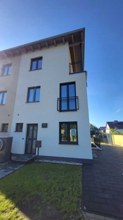 Das Reihenhaus verfügt über eine Wohnfläche von insgesamt ca. 144,00 m², die sich auf drei Etagen verteilt. Im Erdgeschoss befindet sich die offene Küche und ein Gäste-WC mit Dusche. Wohnmittelpunkt bildet das geräumige Wohnzimmer mit bodentiefen Fenstern und Zugang zur Terrasse und Garten. Über eine modern geflieste Treppe mit Beleuchtung gelangt man ins 1. Obergeschoss zu den 2 Schlafräumen. Hier befindet sich auch das tagesbelichtete Bad mit Badewanne, Walk-In-Dusche und Duschtrennwand.