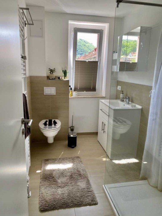 Helle, gemütliche 2-Zimmerwohnung mit großzügiger Küche und Abstellkammer. Das Badezimmer verfügt über eine ebenerdige Echtglasdusche.