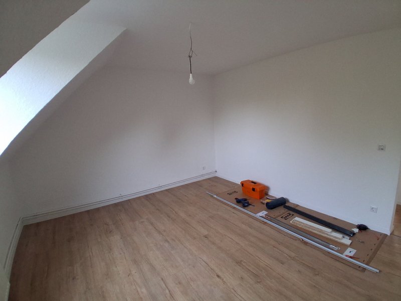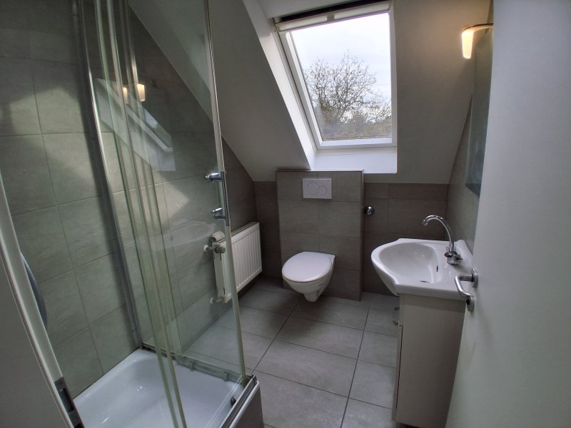 Die moderne Küche ist mit weißen Einbauschränken, einem Gasherd und einem Backofen ausgestattet – ideal für den Alltag. Auch das Badezimmer wurde saniert und verfügt über eine Dusche, ein WC sowie ein praktisches Dachfenster der neuesten Generation, das für angenehmes Tageslicht und gute Belüftung sorgt.