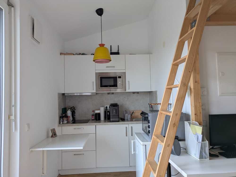 -Möblierung: Einbauküche, Klapp-Esstisch, Hochbett.