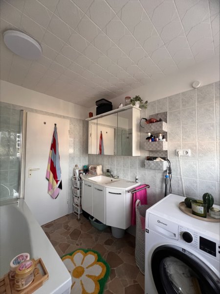 * Boden: Laminat im Schlaf- und Wohnzimmer, weiße Fliesen