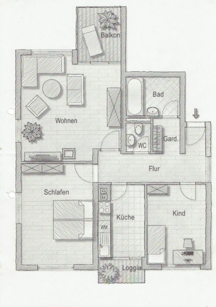Sie hat eine eingebaute Küche, ein Bad mit Badewanne und großräumigem Schrank, ein separates WC, einen großen Flur (mit Sitzgruppe gut nutzbar als WG-Treffpunkt) und 2 Balkone.