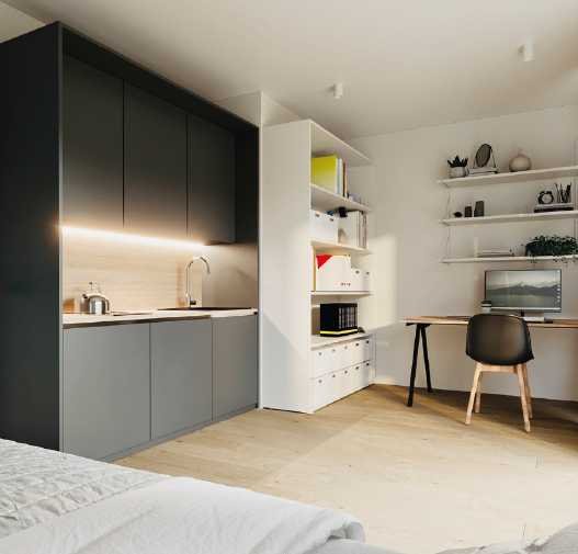 - Vollmöbliert: Bett, Kleiderschrank, Schreibtisch, Regal, Esstisch, Stuhl