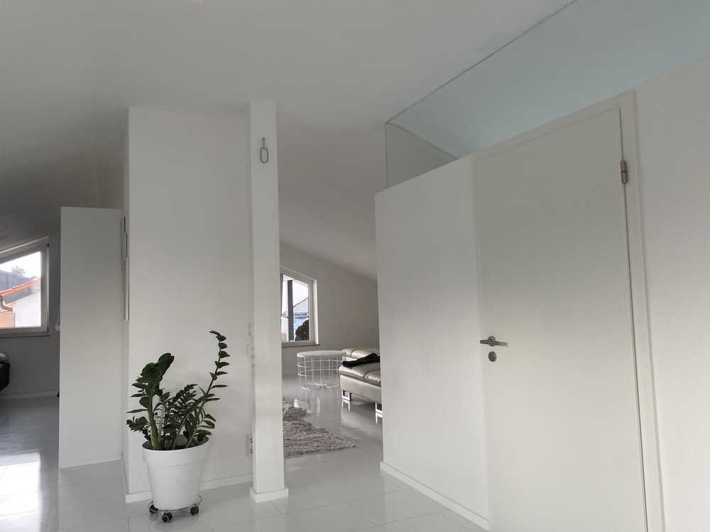 Ab dem 1.12.25 ist eine moderne und sehr helle Dachgeschosswohnung in Loftstyle beziehbar. Sie wurde 2022/2023 komplett neu gebaut, da das obere Geschoss des 3 Familienhauses bis dato im Rohbau stand und nicht genutzt wurde. Erstbezug der Wohnung war 2023. Die Wohnung verfügt über Fernsicht aus allen Fenstern, eine große, offene Küche, einen offenen Essbereich, einen großen Wohnbereich, einen sehr hellen Bad Cube, in welchem sämtliche maßangefertigte Spiegel verbaut wurden und welcher mit Villeroy und Boch WC, Dusche und Badewanne ausgestattet wurde, sowie einen großen Balkon. Es besteht die Möglichkeit den Schlafbereich komplett abzugrenzen. Aktuell ist er nach vorne offen, weshalb er nicht als eigenständiges Zimmer zählt. Seitlich wurde der Raum durch neue, weiße Pax Schrankelemente zum Wohnzimmer abgetrennt. In den Dachschrägen wurden verkleidete (nicht sichtbar) Abstellmöglichkeiten integriert. Vor dem Haus sind 2 Stellplätze vorhanden. Die Wohnung befindet sich in der 3. Etage eines 3 Familienhauses weshalb man bis Stuttgart gucken kann. Ein Hund ist in Absprache möglich. Souterrain wohnt ein 9 jähriger Mops und in der Mitte 5 jährige Maltipoo Hündin. Hunde sollten in jedem Fall kein Problem für die Mieter sein. Die Wohnung kann möbliert gemietet werden, muss aber nicht .