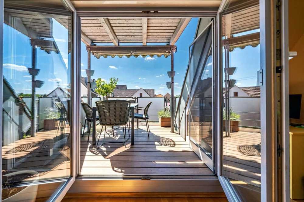 Ein weiteres Highlight ist der großzügige Balkon in Westausrichtung, der mit einer Markise ausgestattet ist – perfekt für sonnige Nachmittage und entspannte Abendstunden mit schöner Aussicht. Viele Fenster der Wohnung sind zudem mit Insektenschutzgittern versehen – für ungestörtes Lüften und angenehme Wohnqualität. Im Schlafzimmer sorgt ein praktischer, maßgefertigter Einbauschrank für zusätzlichen Stauraum, ohne dabei Platz zu verlieren. Beheizt wird die Wohnung zuverlässig mit Erdgas.