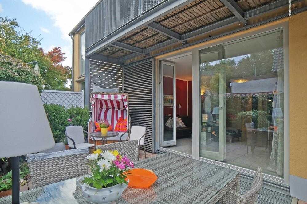 Die Südterrasse lädt zum Verweilen oder zum Grillen ein. Auf Rasen wurde zugunsten der großzügigen Terrasse verzichtet. Auch der Balkon ist Richtung Süden ausgerichtet und von den Nachbarn kaum einsehbar.