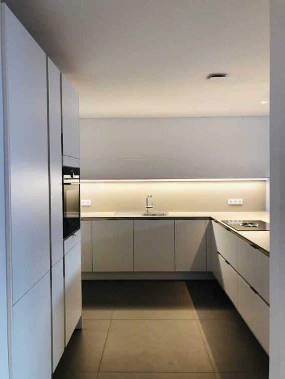 Den Mittelpunkt der Wohnung bildet das großzügige Wohn- Küche mit Zugang zur sonnigen Süd-Loggia. Besondere Details wie Deckenspots mit LED-Beleuchtung und elegante Schattenfugen in den Decken schaffen eine exklusive Atmosphäre.