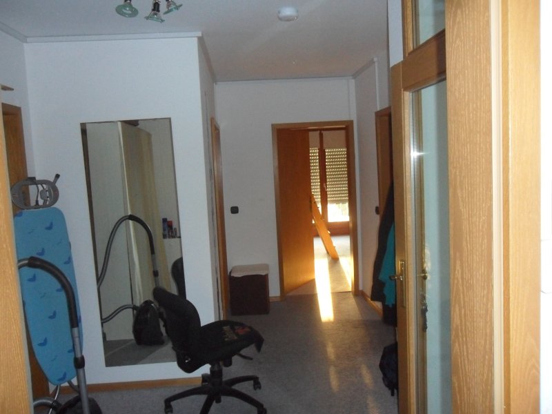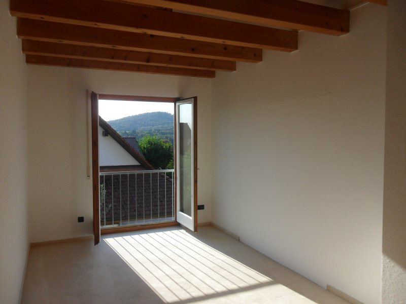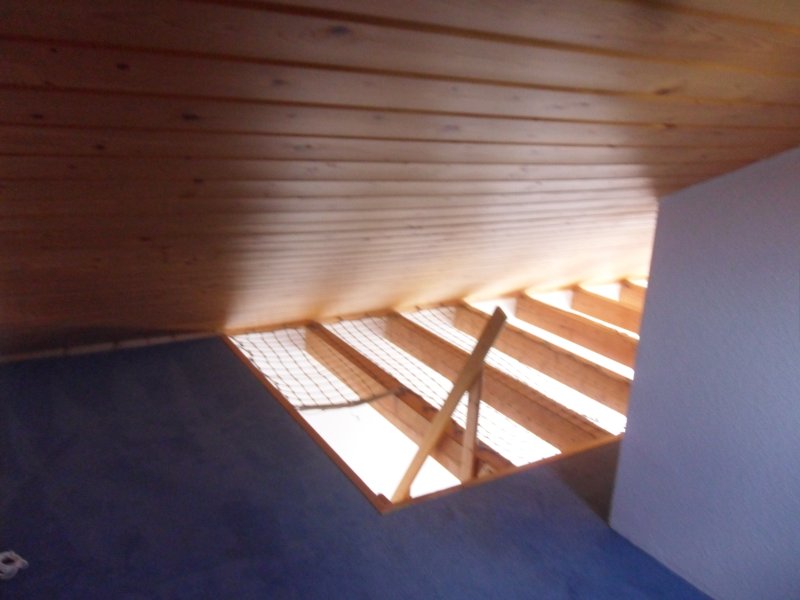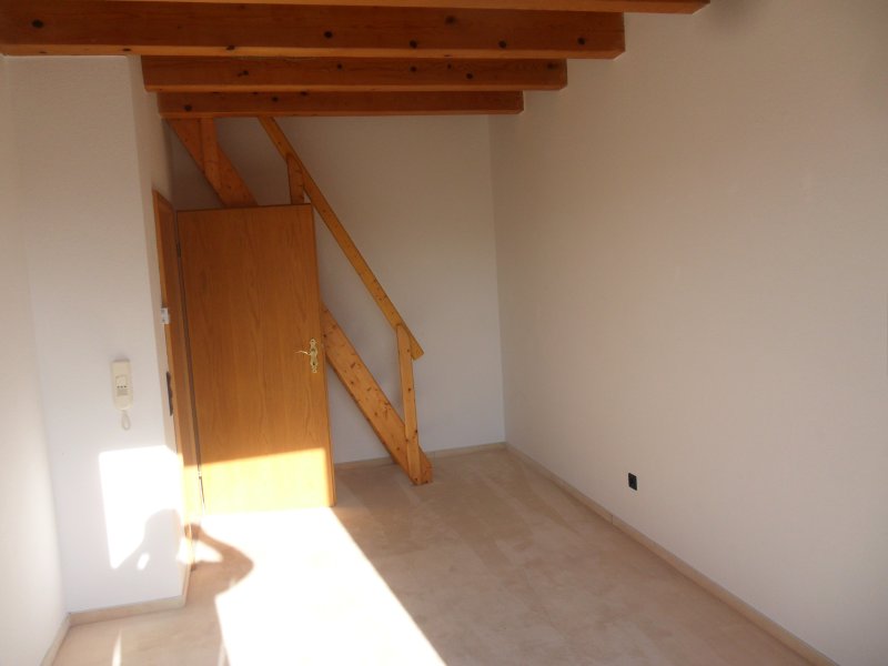 Die Deckenbalken zwischen den Ebenen sind teilweise offen. Der Raum ist lichtdurchflutet. Die doppelflüglige Glastüre nach Westen hin läßt viel Licht rein, und ist mit einem französischen Balkon gesichert.