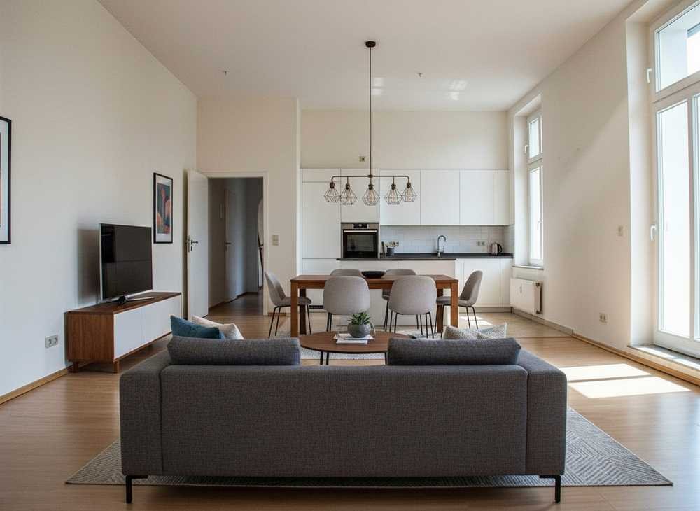 Darüber hinaus bietet der Raum reichlich Platz für eine große, offene Wohnküche.