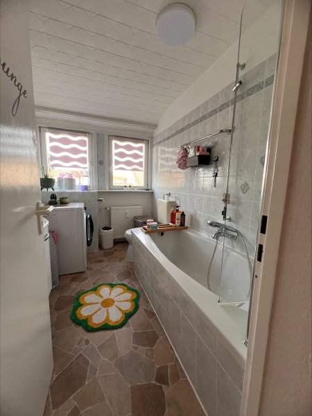 * Bad: mit Badewanne, Duschabtrennung, Spiegel und Unterschränken, WC, WM-Anschluss, Platz für Trockner