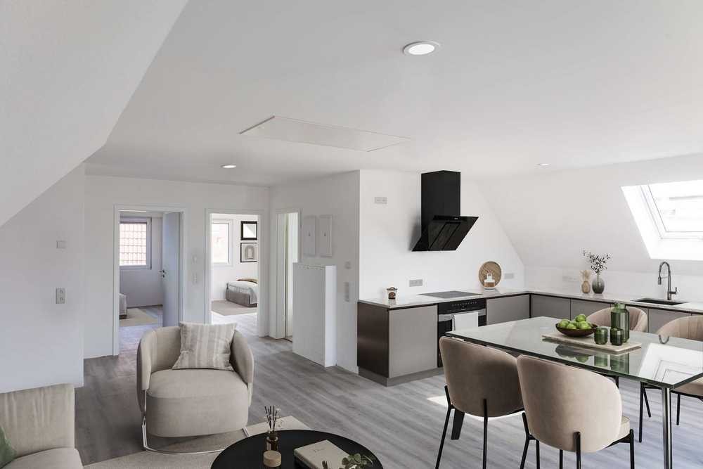 Der großzügige Wohn- und Essbereich mit offener Küche bildet das Herzstück der Wohnung. Großflächige Dachfenster lassen reichlich Tageslicht einfallen und verleihen dem Raum eine helle und luftige Atmosphäre. Die klaren Linien und modernen Oberflächen schaffen eine angenehme Wohnästhetik, während die charmanten Dachschrägen den Räumen einen besonderen Charakter geben.