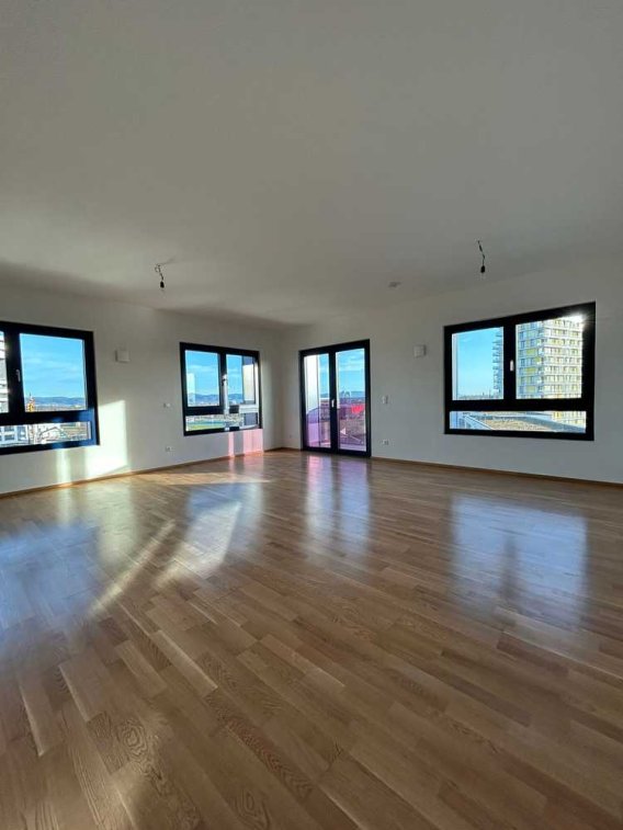 Die großen Panoramafenster, lassen viel Licht in die Wohnung und ermöglichen eine visuelle Verbindung nach außen. Ein hochwertiger Echtholzparkettboden mit Fußbodenheizung schafft Wohnqualität. Eine offene Einbauküche, die nahtlos in den Wohnbereich übergeht ist mit modernen Geräten ausgestattet. Das Badezimmer weist ein zeitloses Design mit gehobener Ausstattung und bodengleicher Dusche auf.
